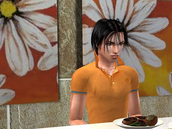 He sat down on one of the chairs and dreamily ran a hand through his hair, intently observing the food on his plate.