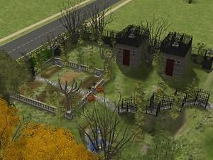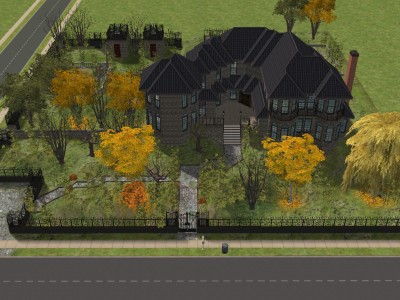 This is my first upload! I wanted a house for fall, Halloween, my vamps, etc… so I built one. This house is not very big, but the lot is impressive and boasts a private family cemetery complete with 2 crypts for those private deceased ones, or your friendly family vampires. Granted the grounds are a bit overgrown and need some TLC, unless you like that kind of atmosphere, but there is the bonus of a sunfilled terrace. The house has a living room with fireplace, kitchen, formal dining room, study and 2 bathrooms on the first floor. On the second floor there are 2 bedrooms and 2 bathrooms. It comes unfurnished as the file is large as is, I stripped most of the content, plus it’s always fun to decorate yourself. It’s not perfect, and still needs some work, but surely someone can enjoy it.