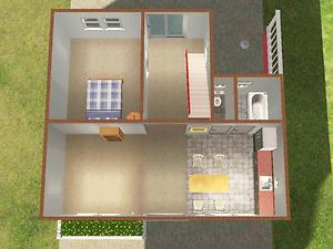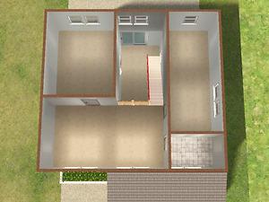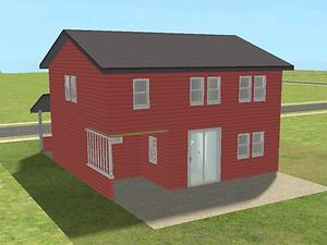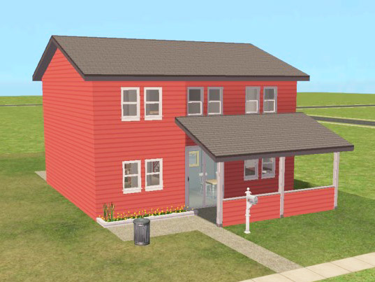 Two-story starter house, sparsely furnished for 1-2 sims but with lots of spare room, covered porch in front + back, some landscaping/decoration.
