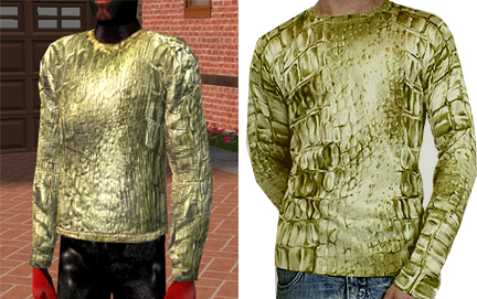 I was looking around for some male designer clothing (for a male model sim I was working on), but I wasn't able to find quite what I was looking for. I found a lovely shirt on a fashion site I wanted to have a try at making, and decided to just use a nice simple maxis mesh since I am such a n00b at this. The one I chose was the long sleeved green ribbed sweater, I believe you shouldn't need any expansions to use it.