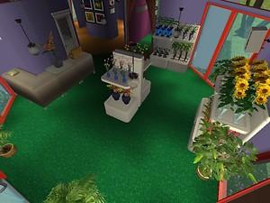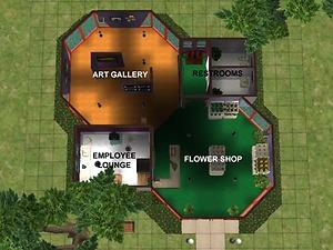 This ownable community lot is a combination retail/flower shop and art gallery, with a small employee's lounge off to one side. The gallery is just one big space at the back of the shop with some blank walls along the sides, as well as two walls in the middle where you can hang some paintings.