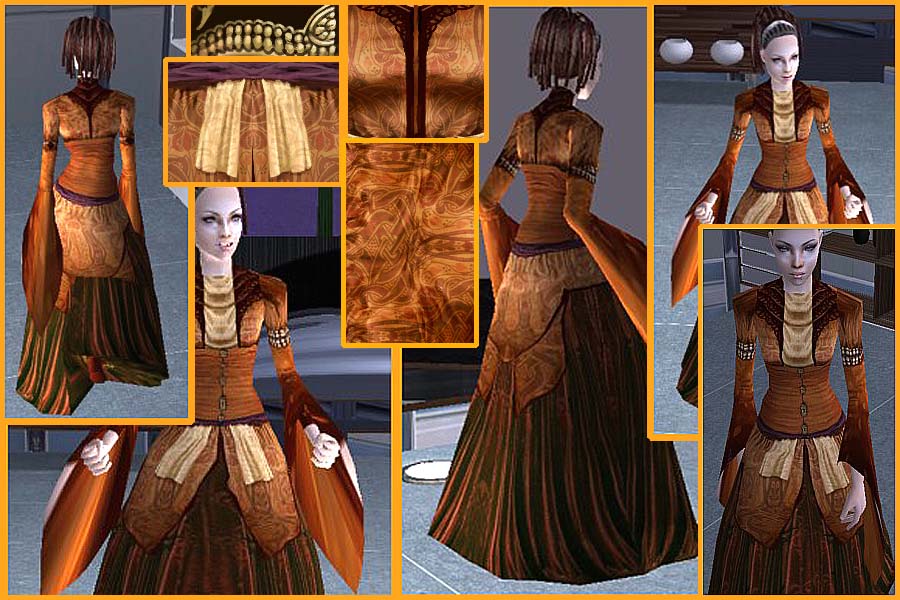 The fabric seems to be some kind of expensive silk(handpainted) and the outer robe is worn with a beige underrobe and a brown, thicker underbust corset with gold brooches.The sleeves are decorated with golden beading as well.I think it cand be used by star wars oriented sims as well as medieval people, though the first one seems to be more appropriate, at least for me.
