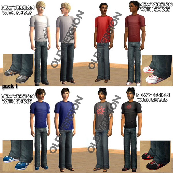 After seeing that a person can actually replace the maxis clothes from the awesome job that Hysterical Paroxysm did here, I was inspired to make my own. So here they are: A full replacement of all 14 of the Maxis jeans and t-shirt/sandal combo. This is a completely new mesh. I always found the original to be a little dumpy and frumpy so I sexied it up a bit. Tighter shirt and such. The jeans are also slightly more form-fitting. Not crazy tight but they are no longer JNCO-style. Obviously It also has tennis shoes instead of sandals.