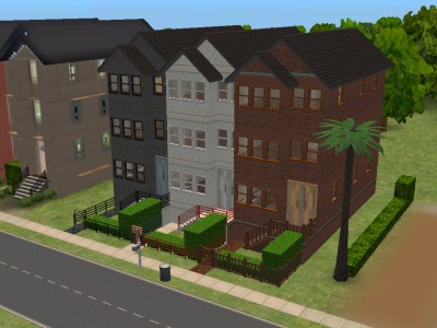 This one three attached row houses, good for your downtown. It's also good if you're familiar with the lot zoning cheat, it would make for a nice dorm or house in university. Each interior is identical but the exteriors are differently colored; I think the colors add some appeal to the lot.