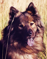 Eurasiers are beautiful, robust dogs of the Spitz family, known for their often exotic fur colours but bred mainly for character and health. Their ancestors are the Wolfspitz, the Chow Chow and the Samoyed, and they show the best qualities of each of them. They are even-tempered and friendly, yet reserved to strangers, they are watchful and loyal to their family. They usually get along remarkably fine with other dogs, cats, and other animals as well as people of all ages. They are relatively easy to train yet keep a certain independence and inbred dignity. You just gotta love 'em!