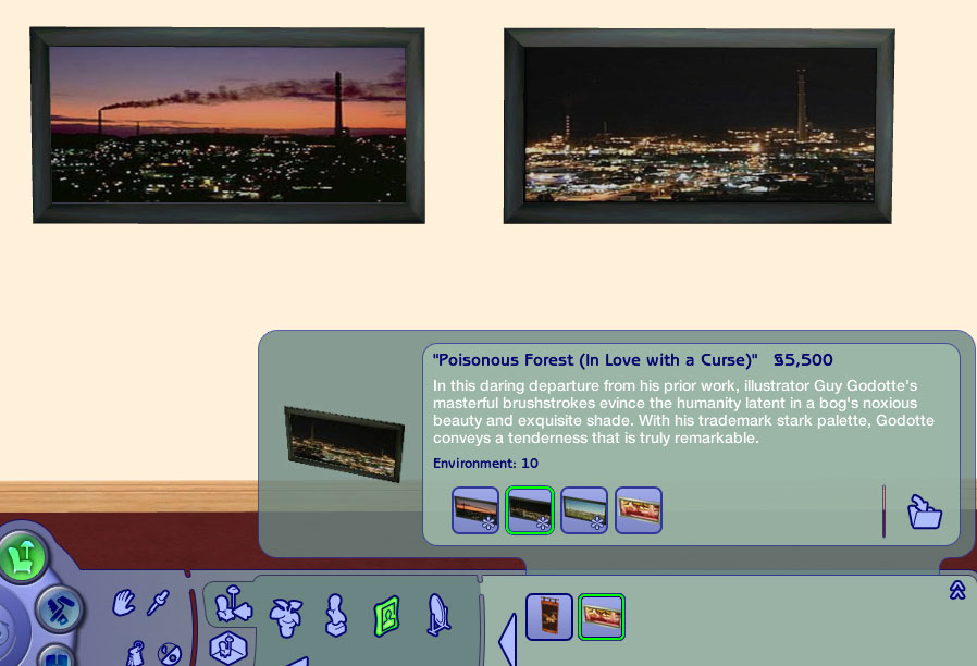 Made as re-colours of the "Poisonous Forest (In Love with a Curse)" Maxis painting. The original did not have any alternates so you will need the CEP (link located below) for these to show in your game.