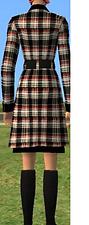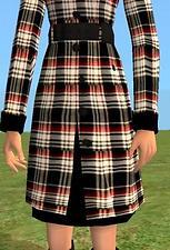 There is a plaidish coat with a black dress underneath and black buttons, collar, and sleeves.