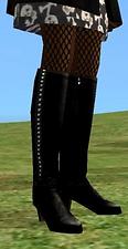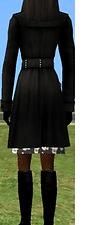 There is a black coat with a skull dress underneath and jewels on the belt and boots and fishnets as well as gloves.