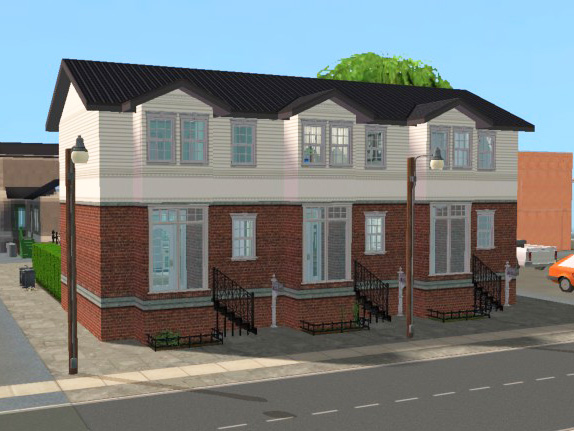 Three tiny row houses for up to 3 sims each (or maybe 4 if you really squeeze them), with a small garden and a driveway behind each house. Two of the houses are furnished, the third one is empty except for bathroom/kitchen/alarms+phone (i.e. like a real-world empty house). Again, these houses are TINY and won't work for raising more than one kid or hamstering skill objects, but they're excellent to stuff some neglected single sims into.