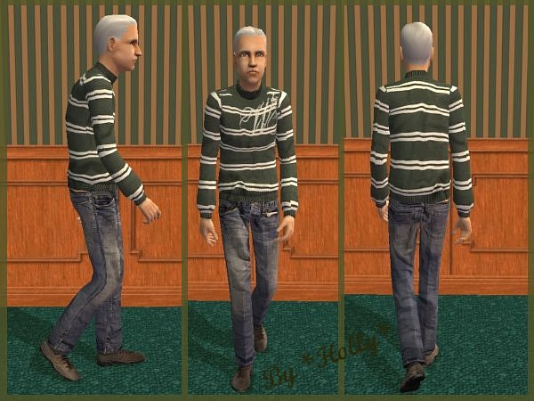 Green striped sweater and jeans trousers.