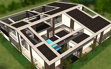 I think the most exciting part is the roof. It's covering the whole lot whithin greenspaces. Therefore, there are some holes in the roof to ensure light for the greenspaces, pool, and balcony.