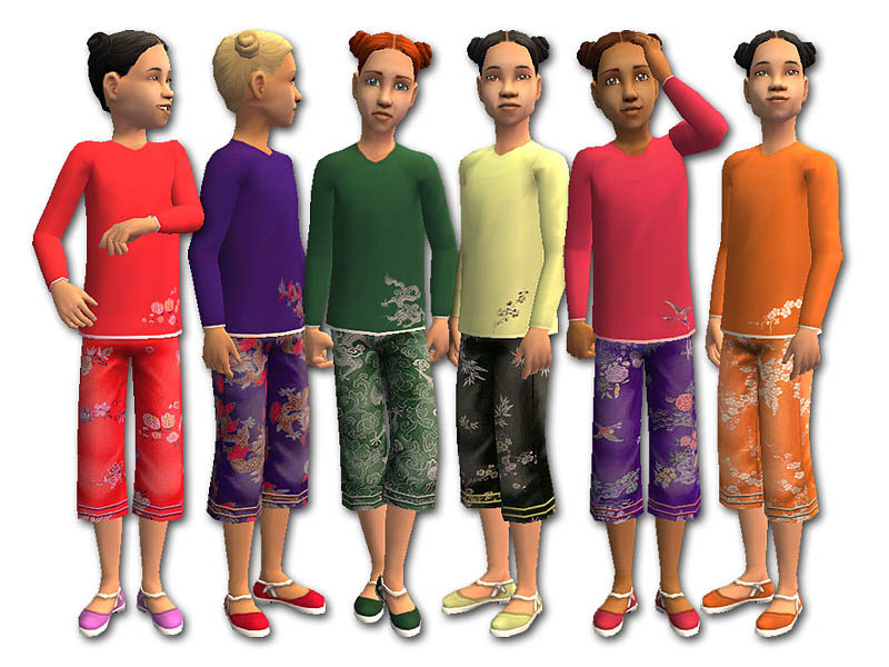 Today I bring you six outfits for your little girl Sims. They're all Asian-inspired outfits, each featuring a long-sleeved t-shirt, pull-on capri pants, and matching shoes.