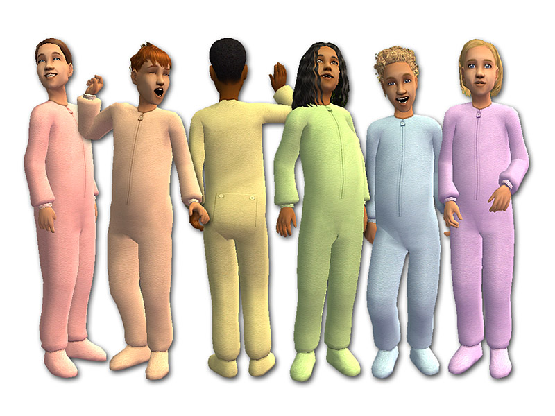 Can't you just see your Sim kids snuggling up to their parents next to a roaring fire, not caring that there's a snowstorm outside? They'll be toasty warm! All of the pajamas are made of the softest fleece. They're a one-piece style with attached feet (but there's a trapdoor in the back in case your Sim needs to go to the bathroom in a hurry!). A zipper with a bunny zipperpull closes the front.