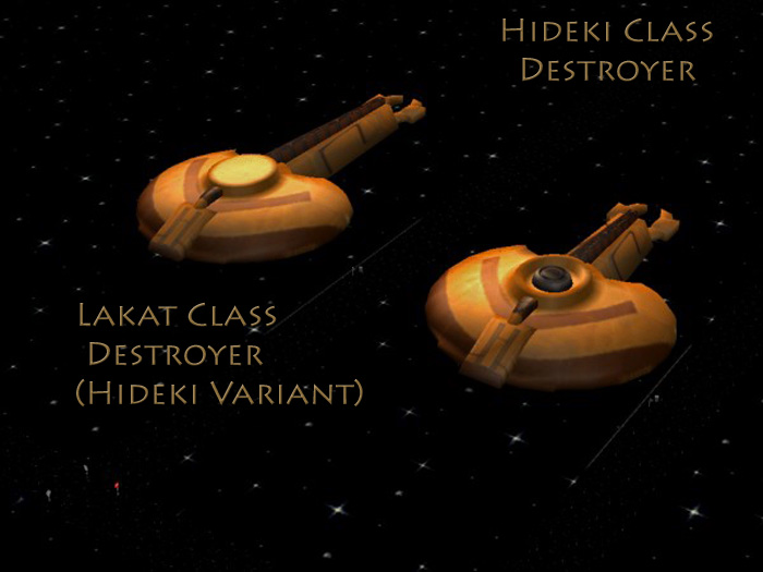 The Lakat class is a minor variation of the Hideki class, and is used primarily by the Obsidian order. The primary hull is only slightly modified, and the Lakat class has a longer aft section. The Lakat class is built on a 5x3 lot and can accomodate a crew of 14.