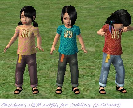 After a long while I finally decided what to make and upload as my first upload! I bring to you three H&M outfits for toddlers! These three outfits came with H&M Stuff for children and I thought they were cute and would look good on toddlers so I made a smaller version for the toddlers. The only difference is that the tops aren't tank tops like they are on the children.