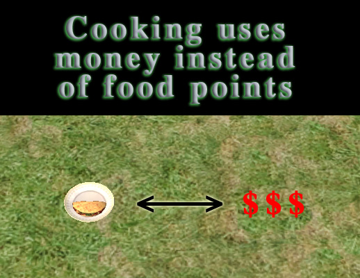 In lieu of using food points (groceries), each meal prepared will instead cost money. This occurs on all types of lots (residential, business, community).