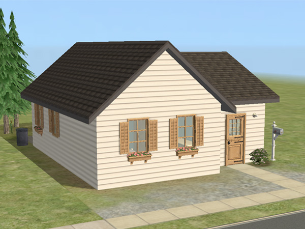 Tiny one-story starter, furnished for 2–3 sims, with room for a garden.