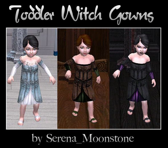 As before the textures are the ones I got permission to use from Stoked4sims at TSR. The toddler good witch is from the Blue Fantasy Medieval Gown texture, and the other two outfits are from the Medieval Fantasy Gown texture, both by Stoked4sims. The gowns work in the everyday section. The mesh is a maxis base game mesh so anyone with the Sims 2 can use it.