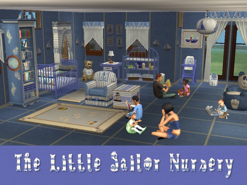 Voilà une nursery complète pour nos petits marins. Mes Sims ont toujours une couleur favorite. Enfin disons plutôt que je leur attribue toujours une couleur spéciale, ce qui permet de retrouver d'un seul coup d'oeil qui va où. Et dans ce cas c'est le bleu, vous l'aurez tous deviné.