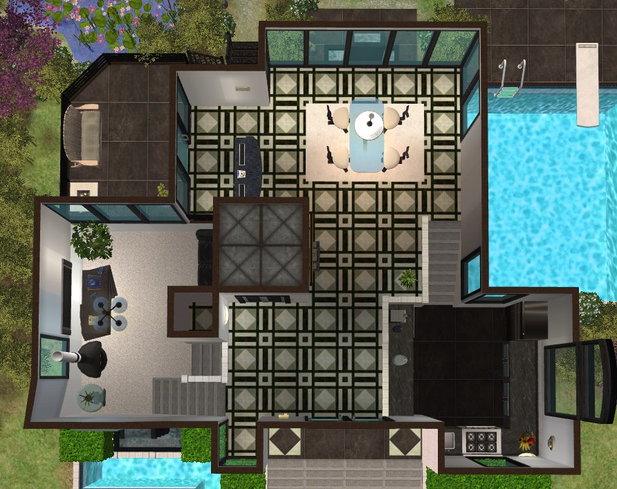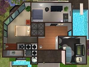 In the garden there is a small eating area, pool, a pond and a fountain. And inside the house there's a lift which takes sims to all the floors which they need to go to apart from the very bottom one.
