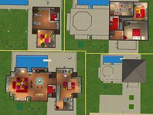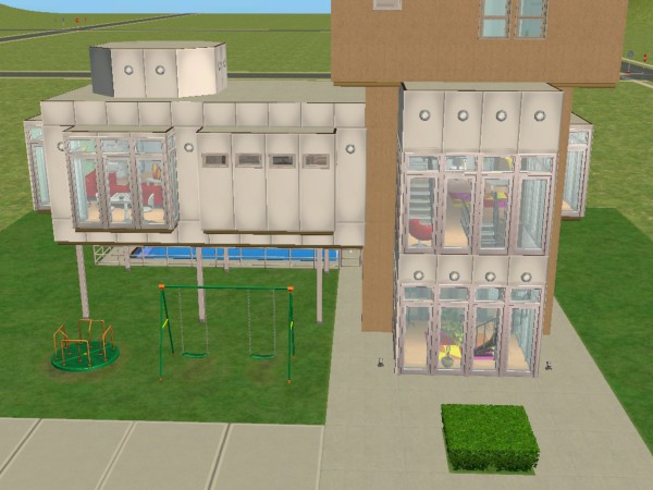 My version has a gym/game room and 1 bathroom on the ground floor. On the 2nd floor there are kitchen, living room, dining room and the second bathroom. On the 3rd floor there are 2 bedrooms, walk-in-closet and the 3rd bathroom. If your sim family needs another bedroom, you can use the gym/game room on the ground floor. Outside there is a swimming pool, playground for kids and 2 driveways. The exterior is kinda gray so I've made the interior more colorful.