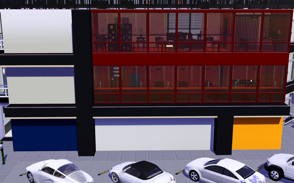 The Composition II facsimile nests firmly on the front of the structure and greets its four owners with its De Stijl nature as they pull into one of the four diagonal parking spaces right next to the zen garden. Immediately inside is the swanky meal area, and famished sims can choose to eat at the island counters or the table. For those that really need to go when they have just arrived, the bathrooms are to the right, just past the bar - one of the bars, anyway. The living room holds the main stash of playthings and bulk of day-to-day existence, and by its own disclosure it's just begging for a guest or six. Artists can jump out the side door to the waiting easils and writers can plant themselves in front of the laptops or browse the custom books in the posh-modern bookshelf. Musicians will have to go upstairs for practice.