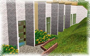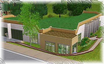 This is a 60's style underground house. I've attempted to emulate the floor plan from a site link provided by Kayllisti: Retro/Earth sheltered House Plan. My version is a 3 bedroom with 2 full baths, "green" room/indoor greenhouse, 2 car garage, kitchen w/bar, dining area, living room, sitting area, atrium/airlock, study, and library/book storage room. I've tried to maintain a modern style 60's theme.