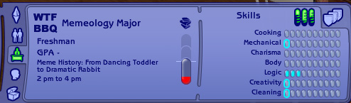 Considering I browse the intarwebthingy more than I really should, I thought it would be good lulz to add in an internet-centric university major to the game. Some won't get the jokes, but the few select who do will definitely enjoy this.