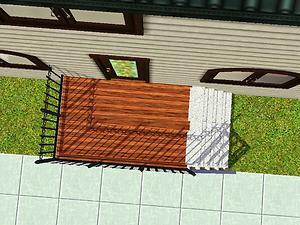 Outside: Deck is fairly small, and the pool has black paint and what looks like marble as the tile for the pools bottom.also the murle painted on the tiling