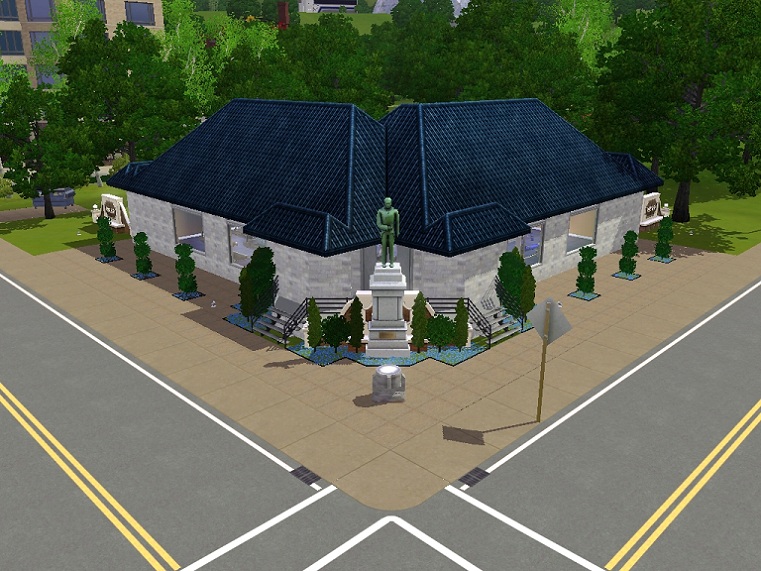The front of the building is chunky and abstract much like the Wellness Gym, but much more tastefully. Greeting gym-goers is a copper statue of Melanie Warn, the man who founded the Gym. Melanie Warn was the happiest person ever, and he wanted nothing more than for others to be happy. As a result of this, he founded many many businesses in SimNation- most of which were completely free to the public and non-profit.