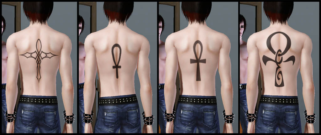 Sooo... this is my first set of tattoos for Ambitions: there are four different designs of the Ankh symbol. Two of them are very simple, while the other two are more decorated. All of the tattoos have only one recolourable channel.