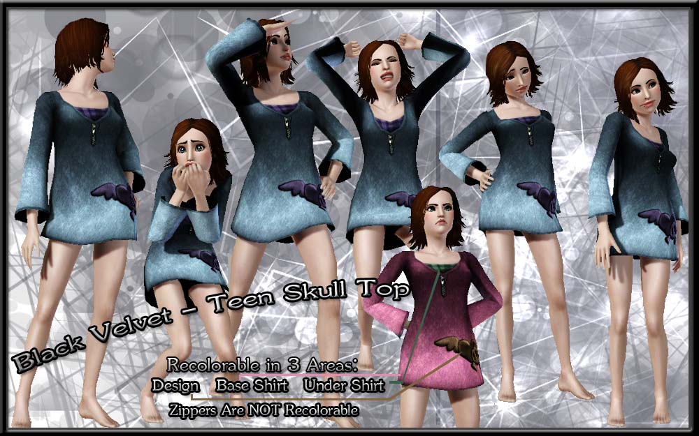 Shirt uses a maxis mesh. Rextextured by me. Skull design drawn by hand. Zippers and Other details drawn by hand using the mouse in photo shop as well.
