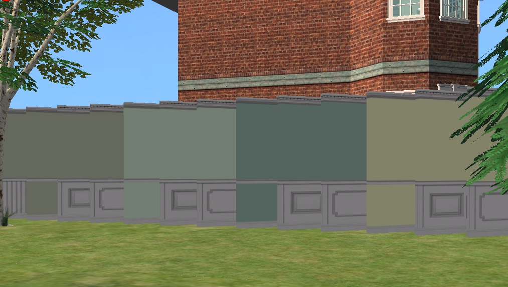 This is a pretty basic set I've been working on for a while. I used to make a lot of walls when I was over at TSR, but was never really good at it. I found that the easiest way to make walls was to take parts and pieces from various Maxis walls and combine them in ways Maxis didn't. Honestly I got the idea because Olive Drab is my favorite paint but only comes in kick/ crown & kick molding options, no wainscoting.