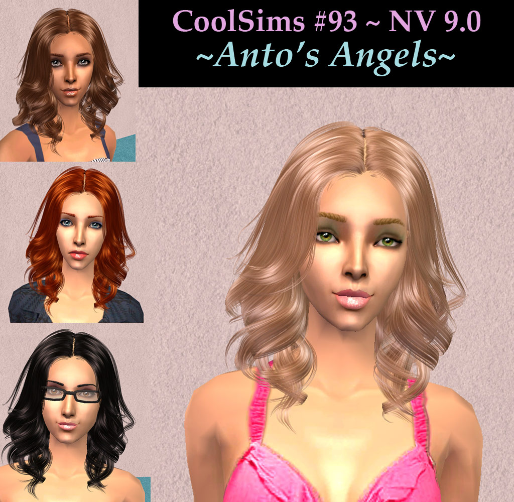 Hi everyone. I'm loving the new hairs at coolsims.net and I am really excited to be recolouring Anto's meshes with my new NV 9.0 textures. I really like his new female hair, #93 for its soft bouncy curls and light-weight animated movements. I wanted to try out my new recolour set on this new mesh because I was hoping to make a fine-textured, shiny and beautiful new look for it. I called it Anto's Angels because the hair reminds me of the Charlie's Angels hairstyles from the original '70s show, lol. I hope you all like it with the NV 9.0 recolour set.