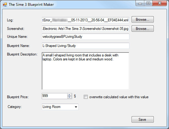- Blueprint Price: When you start the tool, this will say 999 Simoleons by default. When you create the blueprint from the logfile, this price will be replaced with the actual price of the furniture, walls, wallpaper, floors that the blueprint helper wrote to the log in a line beginning with "Value". If you do not want to use the actual price, but rather would like your blueprint to be a little cheaper (or more expensive), you can check the checkbox next to the price and instead of taking the real price, it will take whatever is given as price (either the default 999 Simoleons or whatever you entered).