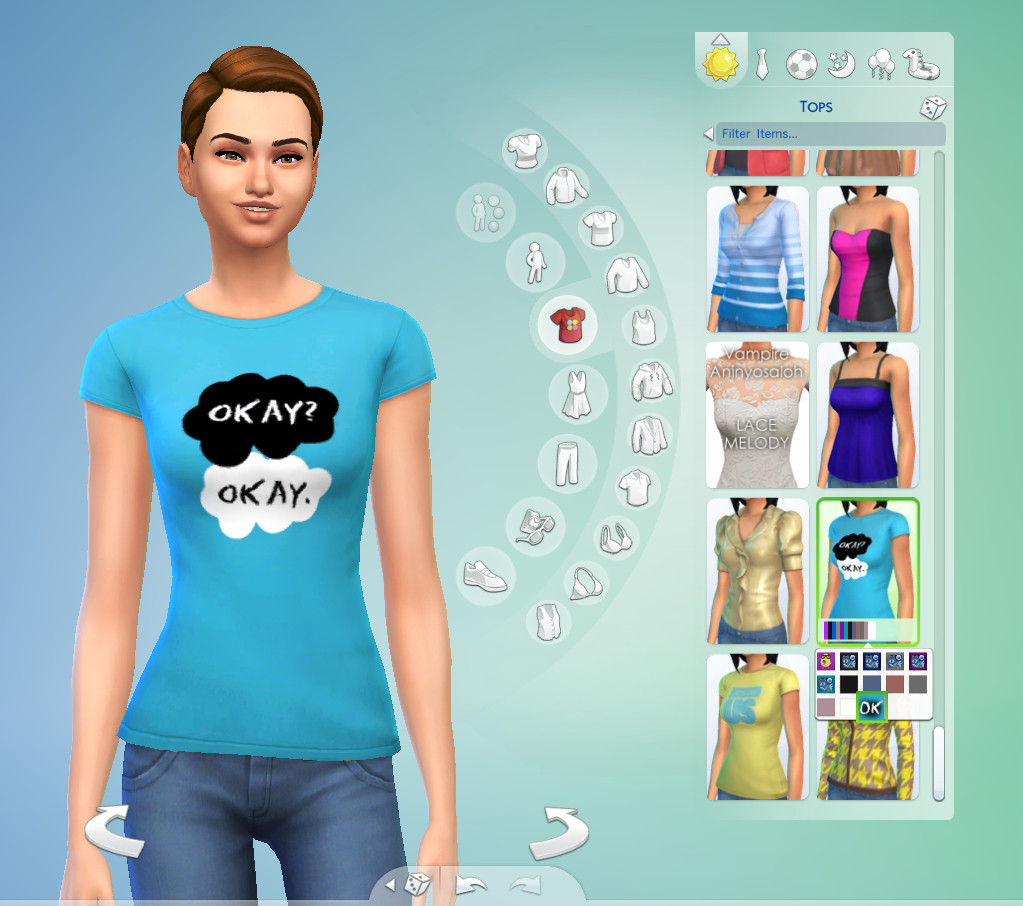 In your game this will show up as a recolor of the purple t-shirt that has the chick on it (you know which shirt I'm talking about? It's the third to last one). I added a custom swatch that says "OK" on it.