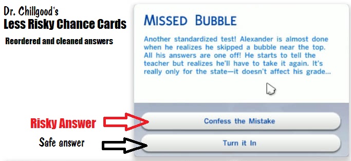 I've reordered the answers so the second answer is always relatively safe. Usually, it's neutral, but sometimes it's "positive moodlet + performance loss" or "negative moodlet + performance gain". I also rewrote some of the offending cards.