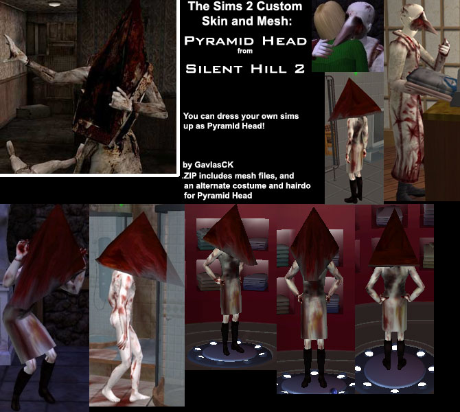 The meshes for this one consists of a knee-length skirt with boots for adult male sims, and a hairdo that (for teens, adults, and elders) looks like a giant red traffic-cone that covers the sim's head and shoulders. Although I've included a sims2pack of Pyramid Head, any adult male sim can moonlight as him by wearing the costume and hairdo.