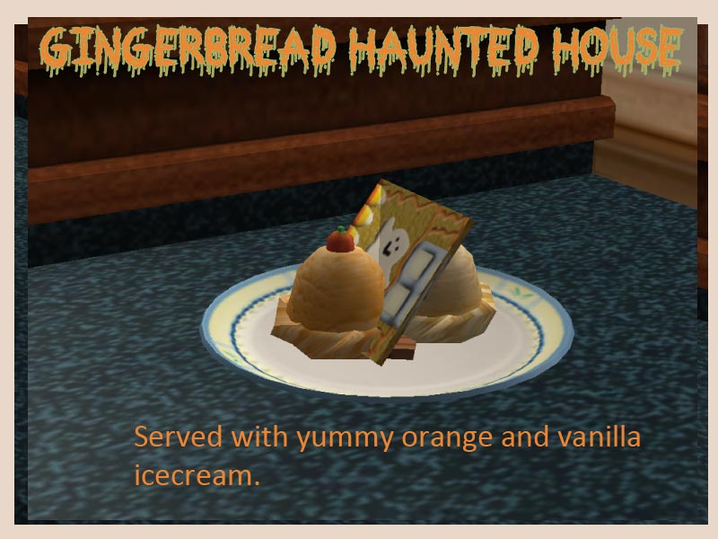 In this upload, I present the “Gingerbread Haunted House”. This dessert is 100% edible for your sims. You can find this Halloween treat in the “Savory Sweets!” tab. This dessert is made from gingerbread cookies, frosting, and candy corns,chocolate bars, vanilla and orange icecream. As you can see, when the half of the house is gone, you can see the icecream in the interior of the house. When served, your sims will also have two icecream scoops with candy pumpkins on top. The Gingerbread Haunted house doesn't have to be baked or put together. It's pre-made and ready to serve since it is cloned from gelatin. Enjoy!