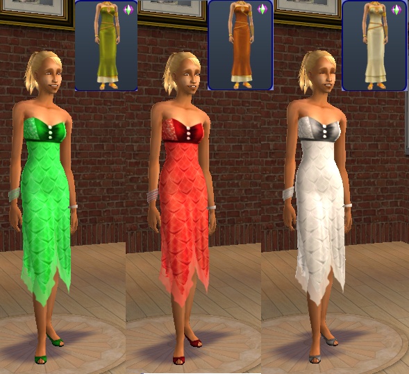 The replacement package uses the Green, Red, and White outfits from the Pineapple Cocktail Dress set by SweetAmberkins. Shoe sounds have been adjusted so that Sims wearing these outfits will sound like they are wearing heels. Like the Maxis originals, they are set as Formal only, and are available to adult and young adult females. Resources in the replacement package are compressed with SimPE. The mesh is by Liana, and is included in the rar as a separate file.