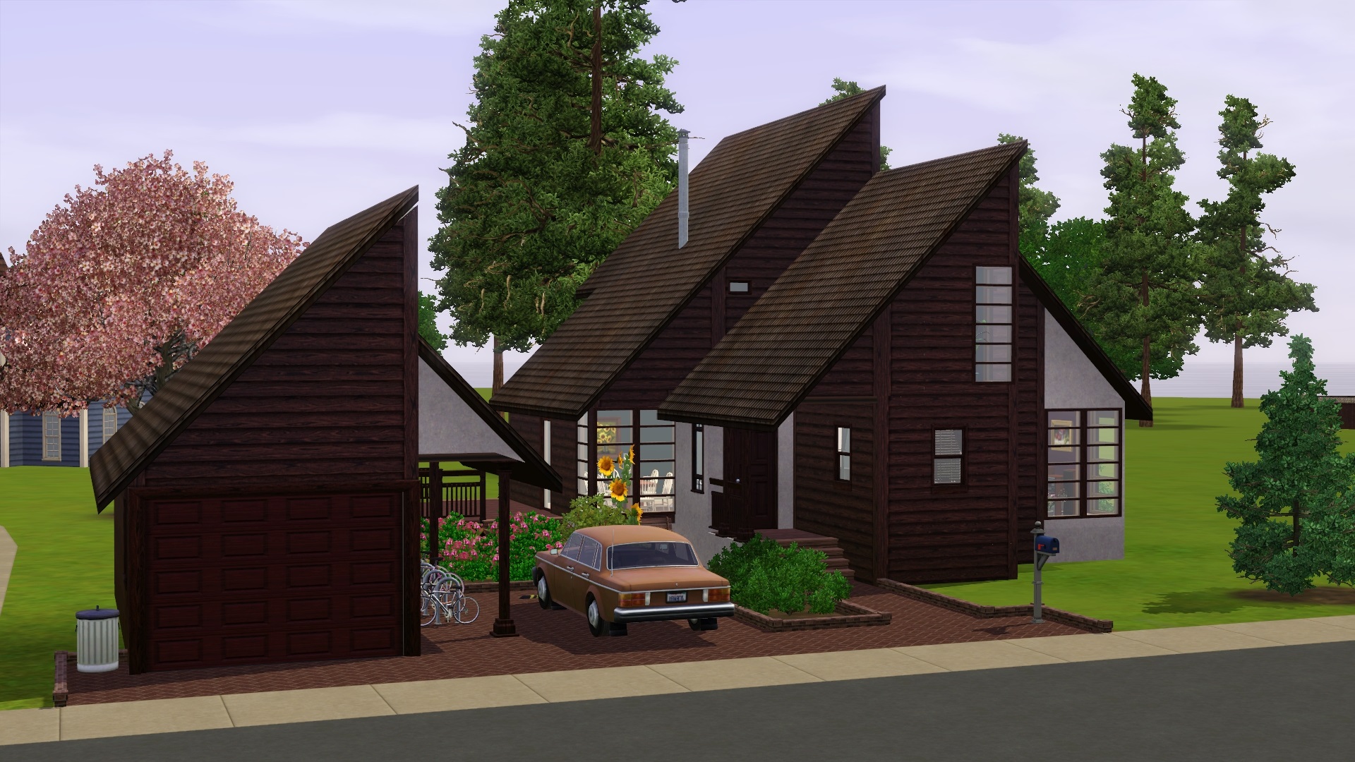 The exterior is a mix of dark wood and concrete based on 1980's architecture. Several shed-style roofs make up the dramatic roof line. In real-life, this design would mean open, airy rooms and clerestory-windows. In The Sims though, this means a somewhat cramped second floor.
