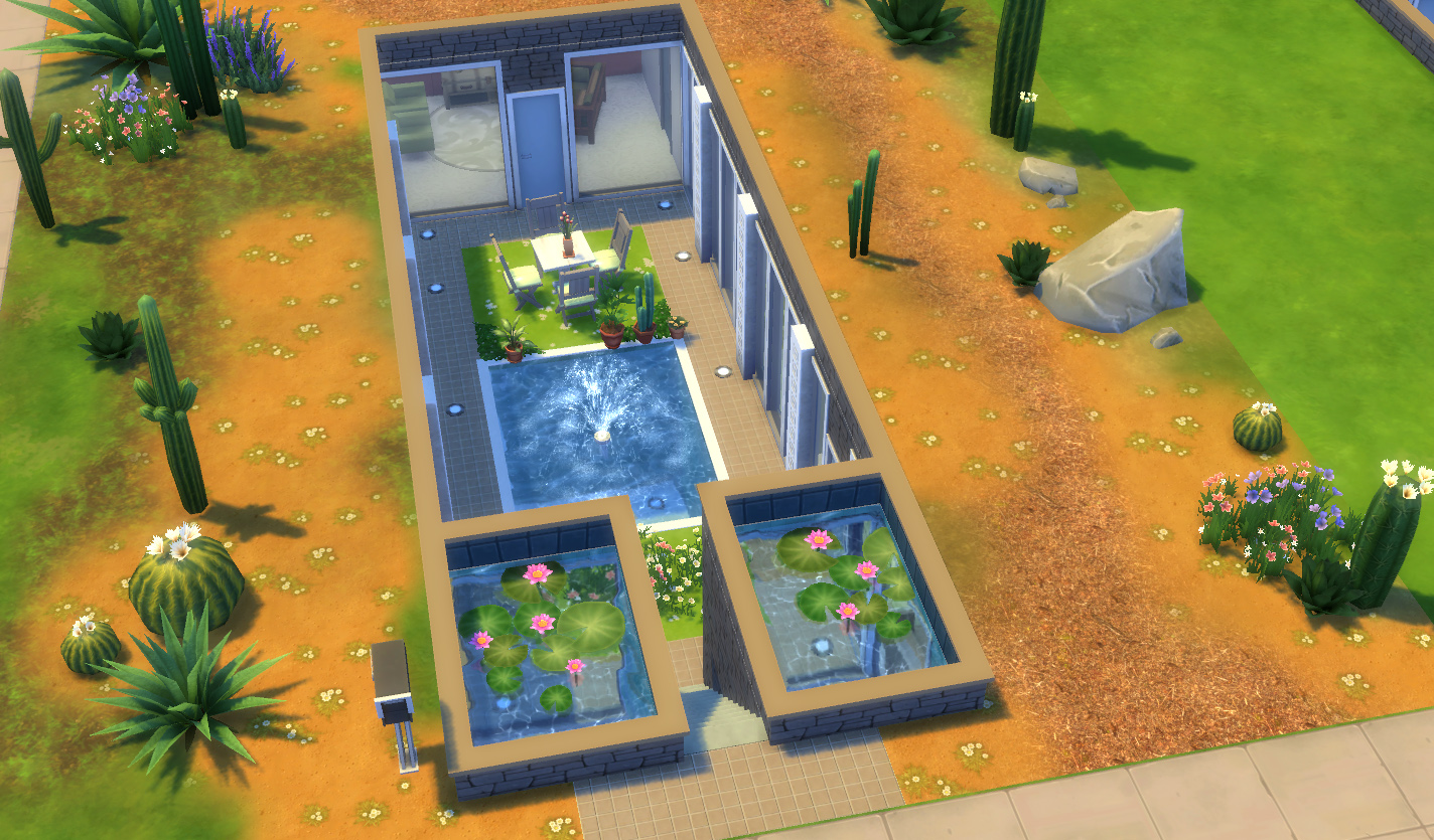 This underground house offers two bedrooms, two bathrooms, a living room and an extra bed/hobby room. It also includes 2 light-well ponds and a pool (the "impluvium"), and a sub-basement that you can expand to meet your sims' growing needs. Yes, you can place windows in swimming pools! On ground level is a desert landscape.