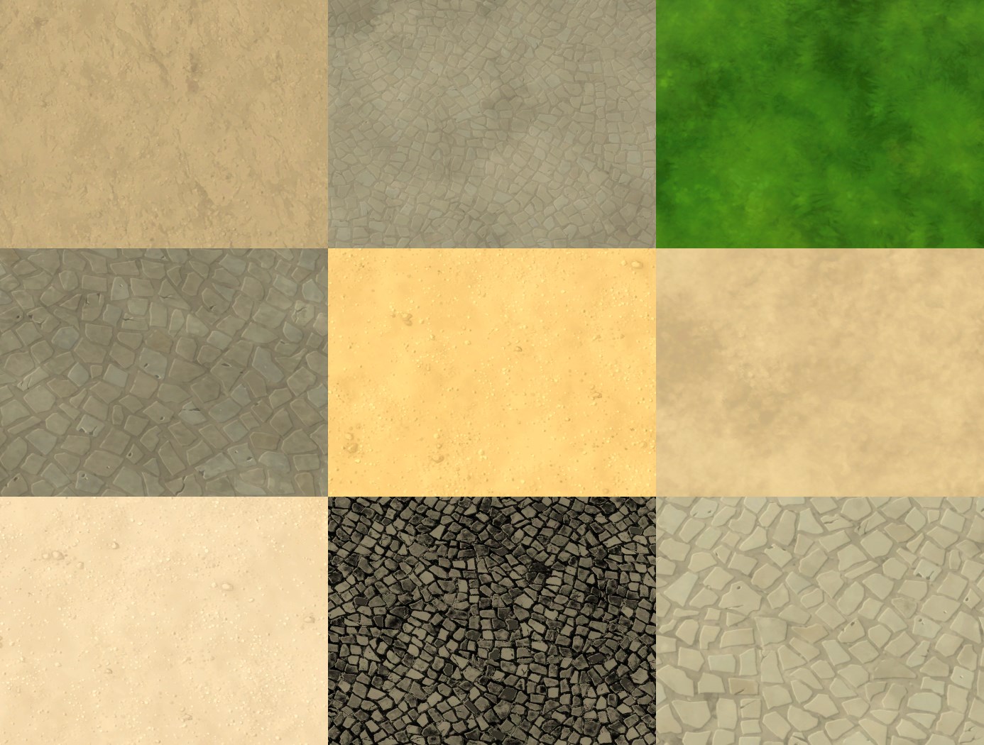 Note that two of the cobblestone textures (the small ones) have a pretty obvious repeating pattern, so they're not really good to use on larger areas. But since they match the other two in colour, they're still useful for smaller parts or to make a large area a little irregular.