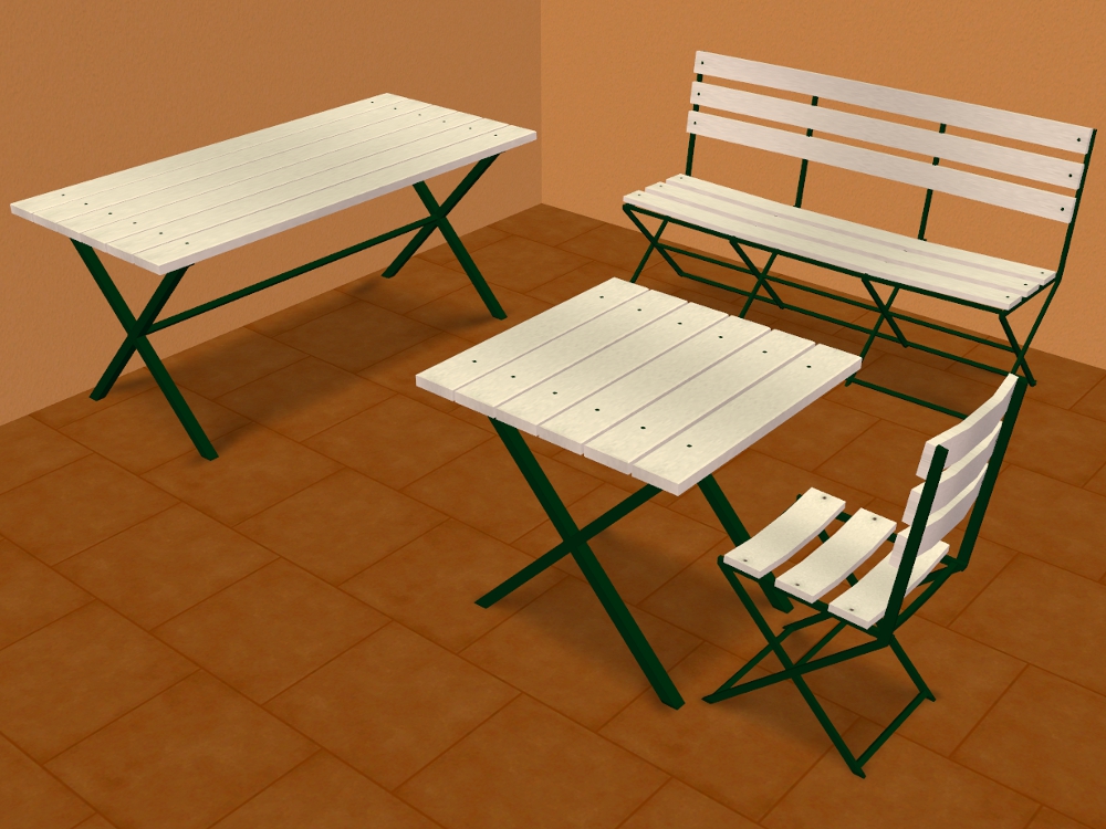 I was recolouring the chair as requested by Goldenbtrfly in Shasta's YETI colours, Fairy Floss, Lemon Drop and LACK colours when it occurred to me that the chair didn't really go with anything in game. Into Milkshape I went and come up with a 1x1 dining table, a 2x1 dining table and a bench seat. All are slaved to the original PatioPlastics Dining Chair so any other recolours you have of the chair should show up on these add-on pieces as well.