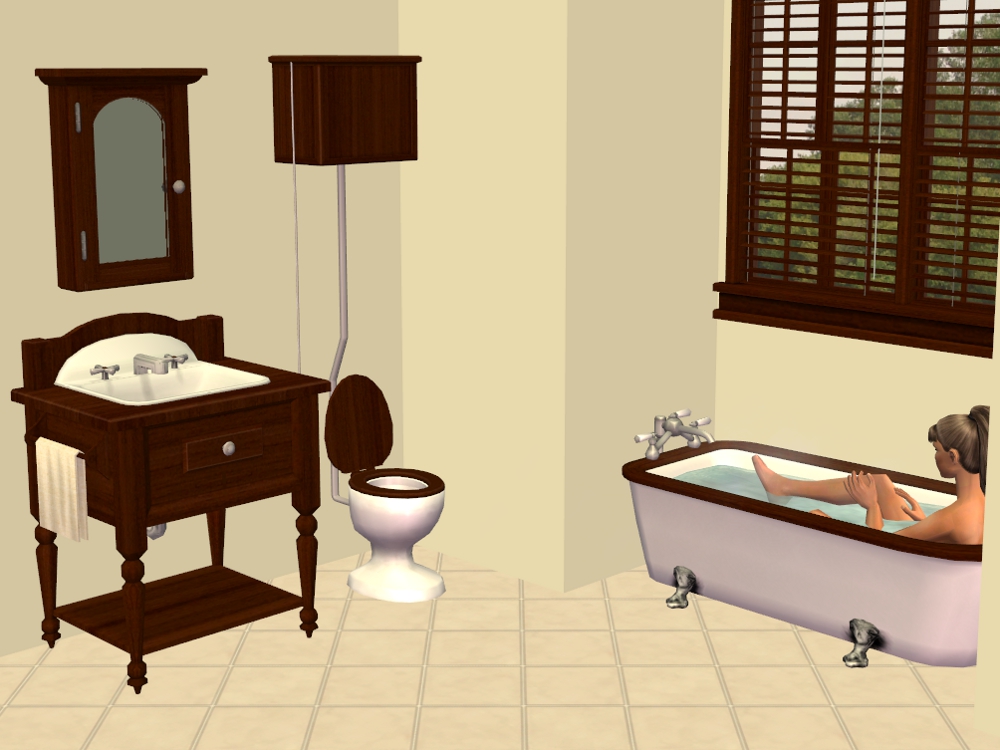 The Refreshing Commode from McKraken Industries, The CabiMirror and The Simple Washer from Kountry Pipes from Seasons in AL Wood and MALM colours. I added the wooden rim on the Base Game Colonial Bathtub By Imperial Plumbing Works to match and a recolour of the fixtures in Silver. You can find my previous Darkwood, Lightwood and Medwood recolours of these objects also the Colonial ComboCleen By Imperial Plumbing Works HERE.