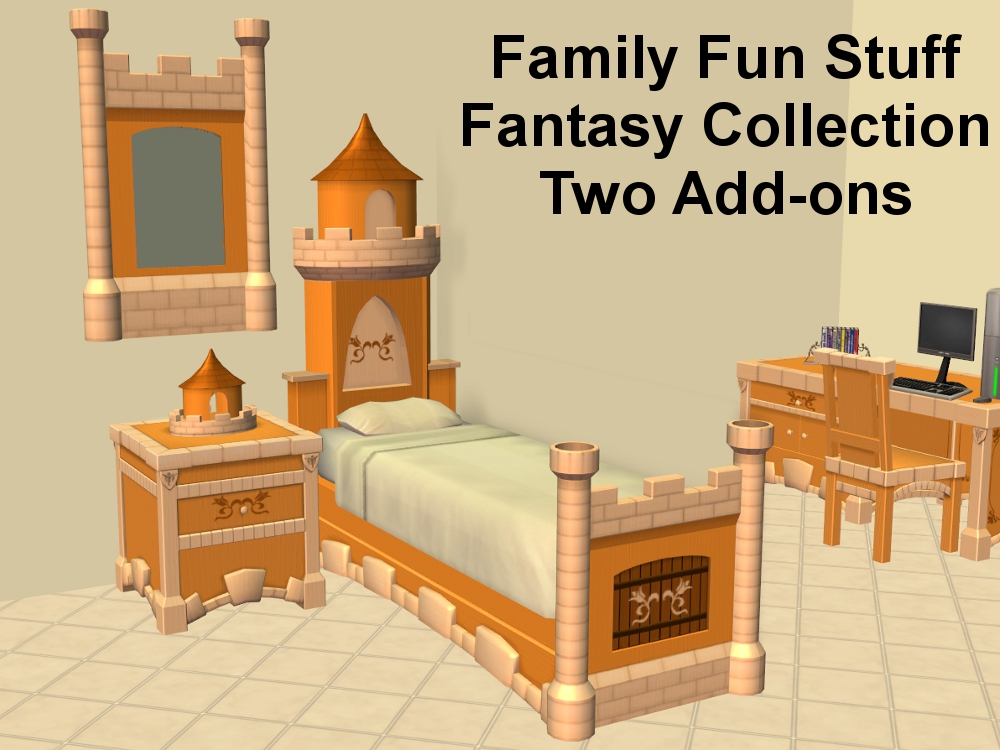 After the Castle Fantasy Bedroom Set was finished, we realized that the small table lamp that was included in this collection was barely a nightlight. So we made a lamp to go with and look more like it belonged to this set - and an add-on was born! Then Michelle got the wonderful idea to do a wall mirror to match, since Maxis did not include any mirrors to use with this set - and so the second add-on was born!