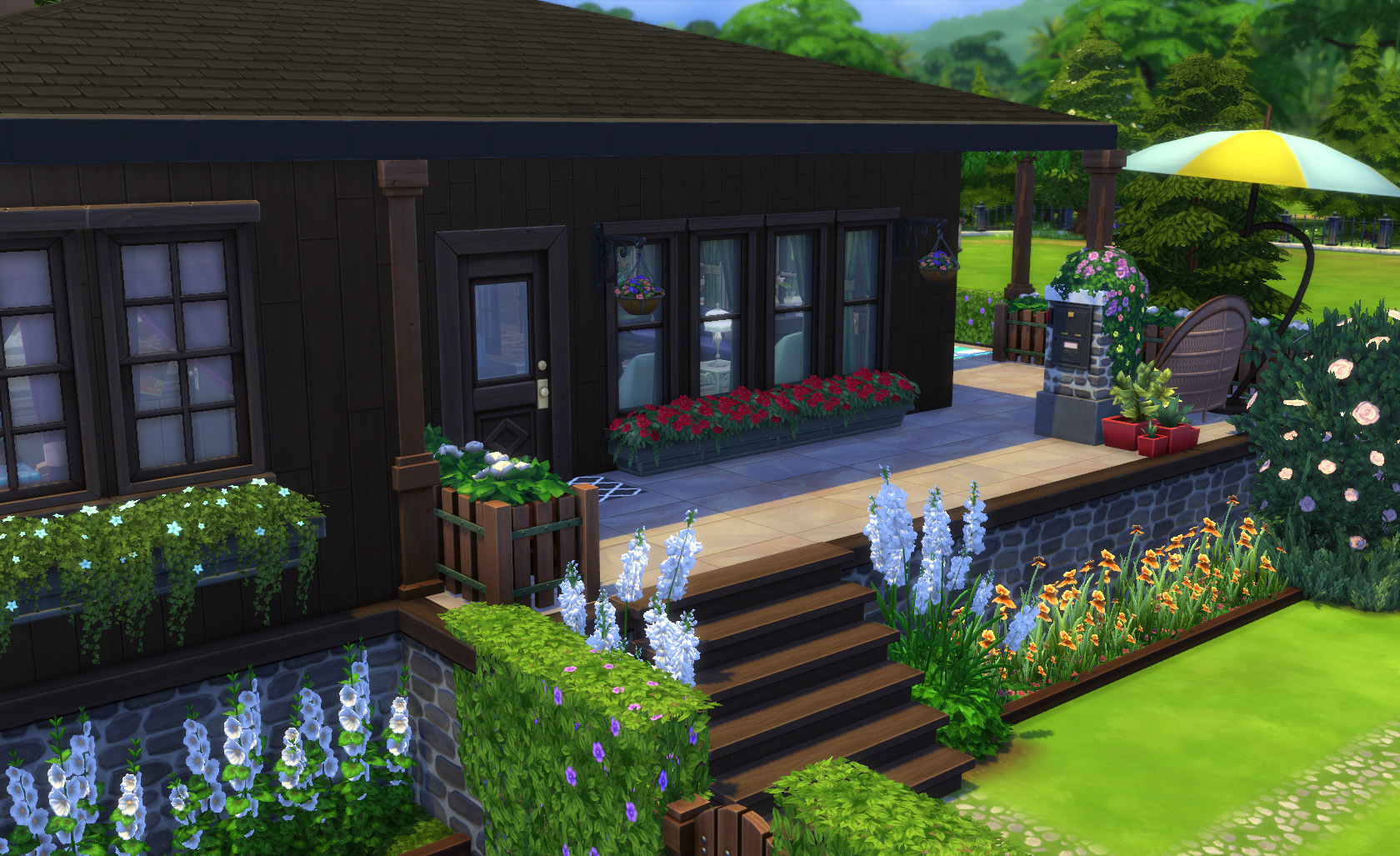 The yard contains the following: a firepit and guitar, treadmill, easel, chess table, tent, bird feeder, woodworking bench, 6 small planters (you'll have to remove the decorative plants from them if you want your sims to garden; otherwise, they look much nicer when they're not empty) and a beautiful natural pond.