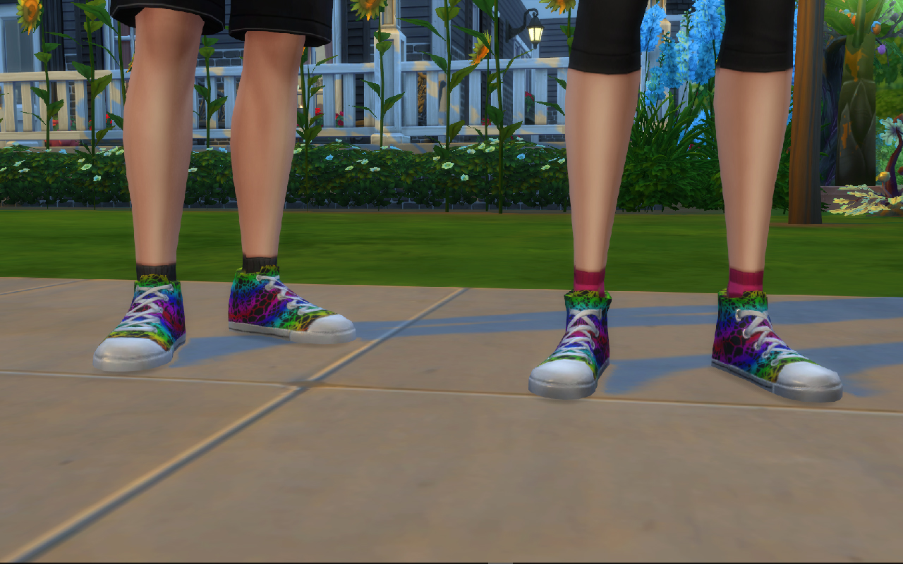 A rainbow lace on black recolor of the canvas hitops from the base game for both male and female.