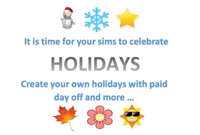 It is time for your sims to celebrate holidays. Have day off from school and work to celebrate with family (of course it does not consume your PTO or performance). Want to have a summer break for your sims when children and teens do not go to school ? Now you can !! (Summer break does not come as pre-made within this mod but you can see in "how to configure" below how to create a summer break). YES, You can customize your own holiday !! SimPE is required but it is very easy. It is up to you how you want to make the holidays for your sims.