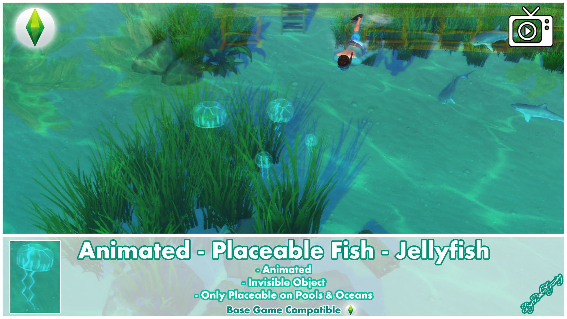 For the animation itself, some more info and example scenes, please click this Youtube Video Link:Bakies The Sims 4 Custom Content: Animated - Placeable Fish - Jellyfish (it's only 3:39 minutes long)